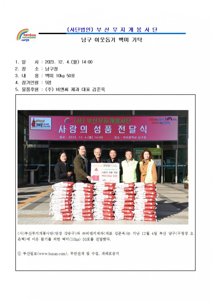 (사)부산무지개봉사단(단장 강승구)과 ㈜비앤씨제과(대표 김준욱)는 지난 12월 4일 부산 남구(구청장 오은택)에 이웃 돕기를 위한 백미(10kg) 50포를 전달했다.