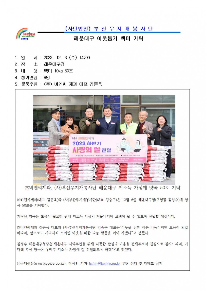 ㈜비엔씨제과, (사)부산무지개봉사단 해운대구 저소득 가정에 양곡 50포 기탁